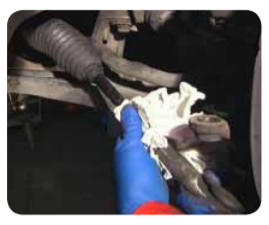 6. Nagyon fontos, hogy gondoskodjon a kormányösszekötő rúd tiszta állapotáról. Oldja a bilincskötést, majd távolítsa el a porvédőt. Vizsgálja meg a kormánymű tömítettségét, és amennyiben szivárgást észlel azt jelezze a tulajdonosnak.